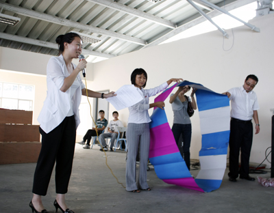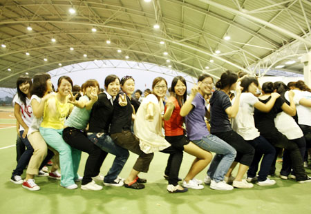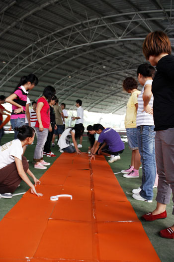 同心协力的快乐 紧接着,“风火轮”再次将大家的情绪推向高潮。制作“风火轮”、小心翼翼地将“风火轮”向前推进,每个团体的成员都积极参与,只为保证团体任务的圆满完成。整个操场上五颜六色的“风火轮”不停地滚动着,与滚动的“风火轮”交相辉映的是此起彼伏的“加油”。 本次团体辅导在最后一项“人椅”活动中圆满结束。大家高喊着学院校训,高唱着团结就是力量,咬紧牙关坚持到底。