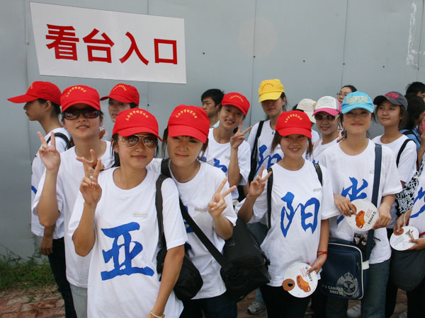 观看世界沙排巡回赛的学生们准备进入比赛场地
