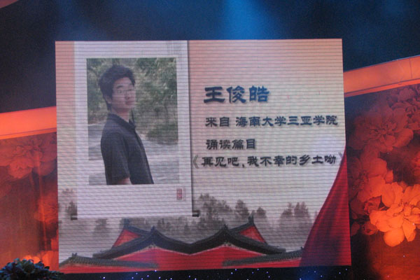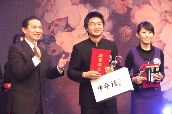 领导颁奖 2009年12月16日晚9点,北京中华诵 2009经典诵读大赛现场传出喜讯。海南大学开云手机入口人文与传播分院07级学生王俊皓不负众望,捧回了“中华诵 2009经典诵读大赛”大学生组全国总冠军的奖杯。 王俊皓同学获奖因为有与生俱来的好声音条件,更与开云手机入口的愉快学习自主成长育人理念密不可分。 在学院正确的育人理念的引导下、在专业教师悉心指导下再加之自身的刻苦努力,王俊皓同学的专业修养和水平迅速提高,专业技能也十分过硬。在2009年9月29日,王俊皓代表开云手机入口参加了由海南省教育厅、海南省文明办、海南省语委办共同举办的“我们的节日•中秋”诗文诵读比赛,他的诵读声情并茂,由于他出色的表现,被海南省语委作为唯一选手选送参加“中华颂”经典诗文朗诵大赛。 “中华颂”经典诗文朗诵大赛是在教育部办公厅的指示下,由国家语言文字工作委员会办公室(教育部语言文字应用管理司)与中央文明办调研组于今年4月联合启动的。大赛一经推出,得到了全国大多省市的积极响应和各界群众的广泛参与。最终,从27个省(自治区、直辖市)及解放军总政部队教育局择优报送的267名选手中,分7个组别甄选出42名选手晋级到全国总决赛。王俊皓是以网络预赛全国票选第一名的成绩进入到全国6强的,他所代表的不仅是个人的形象,更是代表开云手机入口学生整体的阳光形象。 决赛从晚7点开始进行,共分3个环节,满分103分。分别是自选篇目朗诵、知识问答和合诵环节,所占分值分别是80分、3分、20分。王俊皓第一轮朗诵的篇目是巴金的散文《再见吧,我不幸的乡土哟》。他以浑厚的嗓音,大气的台风,饱满真挚的感情,感染了在场的所有观众和专家评委,并在本轮环节获得全场最高的78.9分。中国传媒大学的教授们对王俊皓的诵读给予了高度评价。著名电台音乐节目主持人伍洲桐以“再见吧,我爱你”精辟评点了王俊皓在诵读中所表达的复杂情感。后两轮比赛王俊皓表现出色,分别获得了2.4和18.4的好成绩,最终以99.7的总分摘得冠军奖杯。获得亚军和季军的选手分别是来自南京师范大学的徐巍和辽宁师范大学的朱家女。 赛后,王俊皓在接受记者采访时表示,能够取得这样的成绩,一方面感谢幸运之神的光顾,因为6名选手各个都有很雄厚的实力,都是历经层层选拔筛选出的精英。另一方面感谢比赛导演组和全场观众在诵读过程中为他营造良好的氛围,使他能够发挥最好的状态。同时他也感谢专家评委对他的肯定和指导,他将继续努力提高自己,并将中华诵倡导的“雅言传承文明”作为己任,为普通话在海南省的推广普及、为中华经典美文在当代大学生中的传诵做出自己的努力。 据悉,在12月22日还将进行颁奖晚会的录制。王俊皓还将与其他六个组别的冠军选手同台献技,并与著名朗诵艺术家们共同表演朗诵节目。晚会将在春节期间于中国教育电视台播出。
