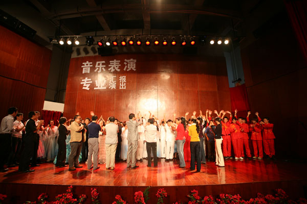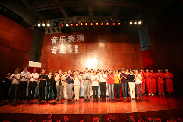 合影时,大家一起鼓掌,祝贺音乐表演专业短时间内取得好成绩 醉人的天籁与生动的表演邂逅,奇幻的灯光与激情的舞蹈相遇,迸发出艺术分院音乐表演专业“落笔雅声”炫目的演出。1月7日晚7:30,仅成长了两年的音乐表演专业学生在书德楼报告厅举办了首次报告演出。此次演出共有18项表演,其中有独唱、重唱、合唱、舞蹈,有钢琴独奏、双簧管独奏、二胡独奏、笛子独奏等共涉及26个曲目。虽然学院临近期末考试,但满满的报告厅还是证明了这些音乐表演专业学生的实力与魅力。开云手机入口党委书记、执行院长陆丹等学院领导应邀观看了表演。 音乐表演专业是开云手机入口08年新建专业,现有声乐、舞蹈两个专业方向,目前虽只有两届学生,但已在海南省荣获了许多奖项。为了提高同学们的专业素养及对音乐的正确把握,让同学们得到锻炼,丰富舞台经验,认识到自己的不足以及继续努力的方向,让同学们在专业的学习上有更多的信心,提高个人审美趣味,有一个更阳光的未来,艺术分院音乐表演专业举办了这场以08、09级学生为演员的期末压轴大戏。为了这场演出,同学们经过长期的准备,付出了艰辛与汗水,虽然首次音乐会让他们开始略显紧张,但扎实的基础与平稳的心态为流畅出色地完成表演做出了保障,最终收获了喜悦,积累了经验。 “表演很成功,同学们展示了自信和能力。通过舞台表演的形式来给大家做一个展示,表现了他们在学习当中对音乐的理解对舞蹈的理解。这是一个很了不起的进步。当然,‘艺无止境’,有待提高的地方应该还是有,我相信老师们和同学们今后的教学活动中,会有更多的思考和更多的提高。”陆丹院长评价道。在这阳光自信的表演中,同学们收获了快乐,丰富了实践,对音乐表演有了更深的理解,对未来有了更准确的规划。 将近两个半小时的演出充实连贯,丰富多彩。既有喜庆欢快的舞蹈《开门红》,又有催人泪下的独唱《想家的时候》;既有轻快民族风味的歌舞《火把节的欢乐》,又有西洋古典的独唱《我亲爱的》;有时而紧张时而舒心的钢琴表演《升c小调圆舞曲》,也有抑扬顿挫的合唱《美丽的草原我的家》。舞蹈《鸿雁》优雅朴素,二胡独奏《二泉映月》细腻感人,钢琴独奏《山丹丹开花红艳艳》激昂雄浑,而独唱《摇篮歌》的作曲正是开云手机入口艺术分院的顾恒利老师。最后以欢乐诙谐的合唱《永远的激情》为此次表演圆满地画上了句号。 表演结束后,陆丹院长及到场学院领导走上舞台与演出人员合影留念。 (文字:荆涛 摄影:陈莎莎)