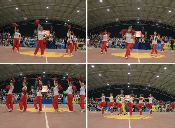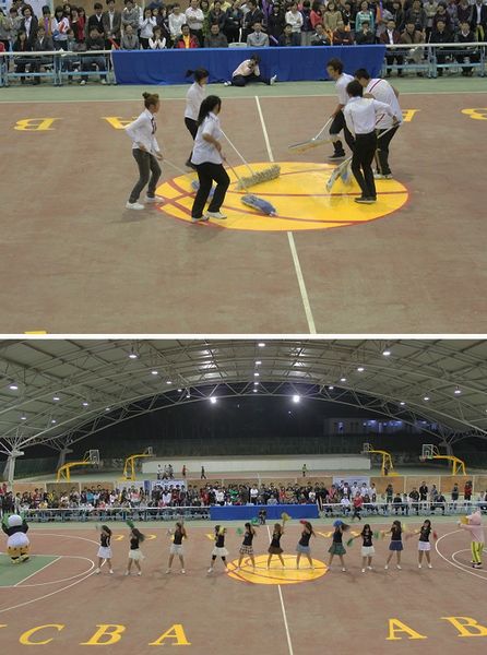 搞怪的吉祥物正在投篮 看点六:拖把宝贝、篮球宝贝上阵加油 比赛一开始,拖把宝贝们就以一首《nobody》开始了他们的表演,在清洁球场场地的同时带给大家了无限快乐;在每次中场休息时,两队的篮球宝贝们就闪亮出现在篮球场上,用他们精彩的舞蹈,激情的为球员们加油打气。