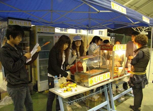 勤劳的拖把宝贝与激情的篮球宝贝 看点七:ucba grocery 在紧张激烈的运动场旁边,还有一处小憩的地方,那就是我们的便利小卖部(ucba grocery)。在这里是学生当任销售员,有供应各种饮料、烤肠、免费提供爆米花等,大家可以边欣赏球赛边享受生活的美好。这样不仅可以给全体师生提供饮食,而且可以让学生得到锻炼,让他们靠自己的能力努力促销商品。