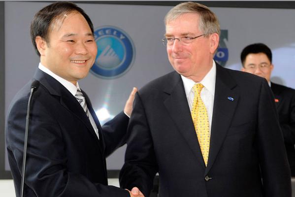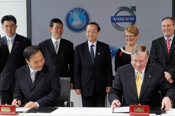 2010年3月28日 股权交易签订现场 (从左至右)浙江吉利控股集团李书福,福特汽车cfo lewis booth,(后排)wang naipeng, huang keqina, 工信部部长李毅中,瑞典副总理maud olofsson,沃尔沃总裁兼ceo stephen odell