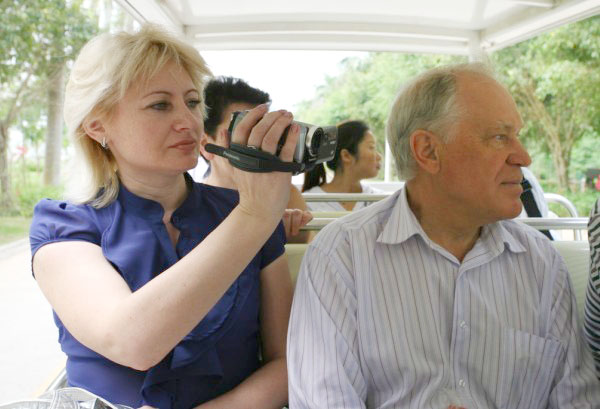 客人们热情地为陆丹院长展示小礼品俄罗斯套娃