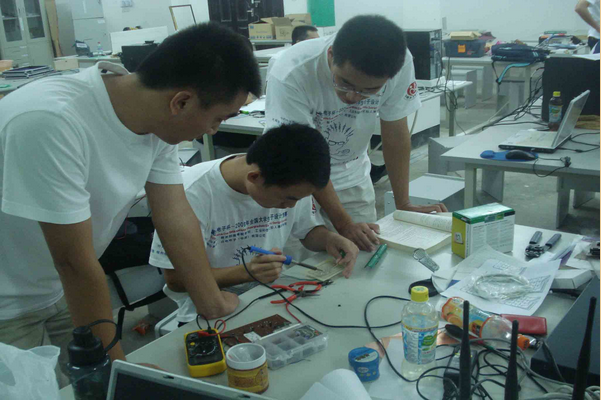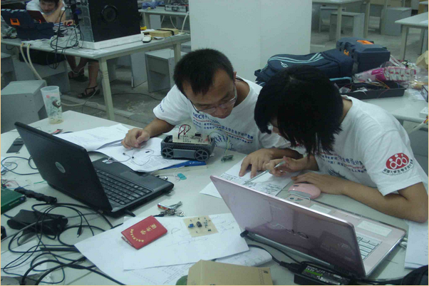 参赛队友研究认真电路图 练兵千日,终须实战。大赛如期而至,这是对我们的真正考验,也是我们展示的机会。不只是我和我的伙伴,所有的参赛选手都一样,从一开始就不敢有丝毫的松懈。认真地研究题目,积极地搜索资料,小心地求证方案,精心的焊接电路。虽然我们在赛前做了很多准备,但是在比赛中还是遇到了许多意想不到的麻烦。不知多少次否定了好不容易想出的方案,不知多少次修改就要出炉的作品,不知多少次放弃了测量好的数据。电路修了又修,程序改了又改。尽管时间一分一秒的流逝,但我们相信只有勇于否定错的,才能找到正确的答案;尽管我们越来越疲惫,但我们相信只有坚持到底,不轻易言弃,才能笑到最后。转眼到了比赛的最后一天,也是最关键的一天,这不仅是对我们智力的考验,更是对体力和意志力的考验。在这关键的一天里,每个人都眼窝深陷、满脸疲倦,但又都精神亢奋、忘我地工作。我们的作品也在这一天终于成型,经过测试,达到了一大半的题目要求。虽然欣喜但大家都没有在脸上表现出来,因为我们知道精益求精的含义,只要比赛没有结束,我们就不能停止对作品的完善。