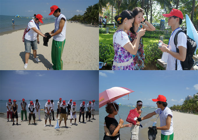 椰风海韵中,我们在行动 中午,志愿者们顺利到达三亚湾,对三亚湾的沿海线沙滩进行了捡垃圾活动,并向过往行人进行了宣传并认真倾听了他们对环保的意见和态度。更让人意想不到的是志愿者多次用英文对外国游客宣传此次活动的意义时,这些外国游客大多数居然用中文回答了志愿者问题,而且回答的相当流利,并详细的介绍了他们自己对海南国际旅游岛环保看法,并提出了宝贵的意见和建议。