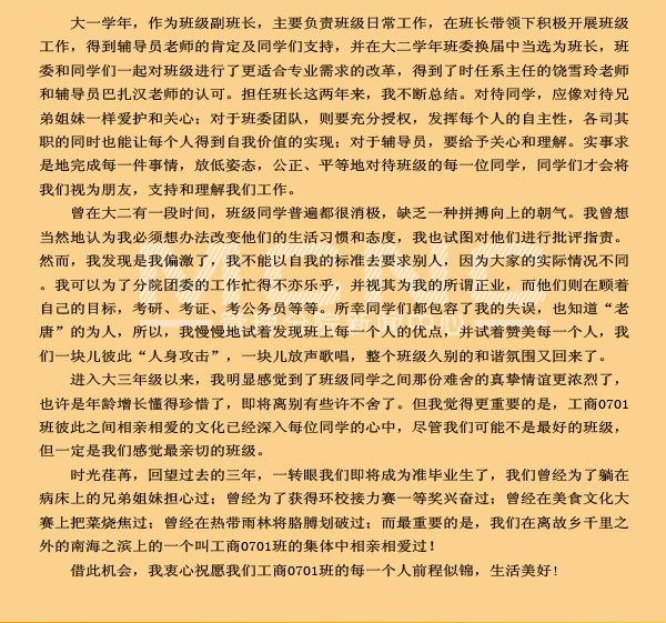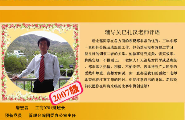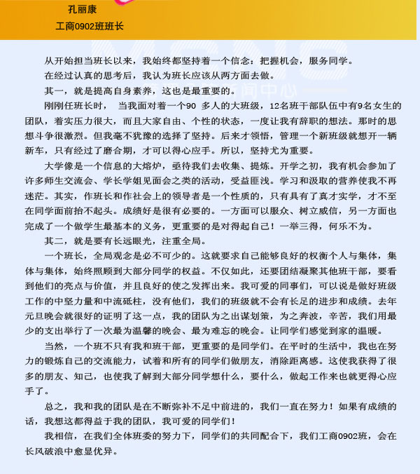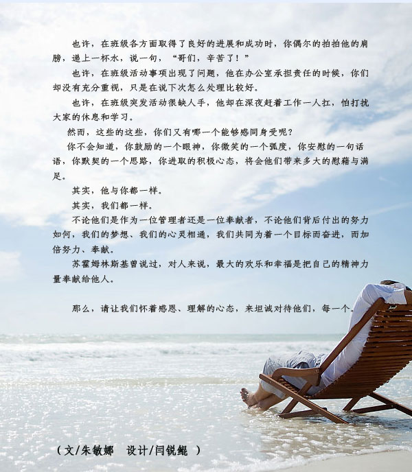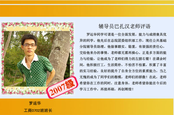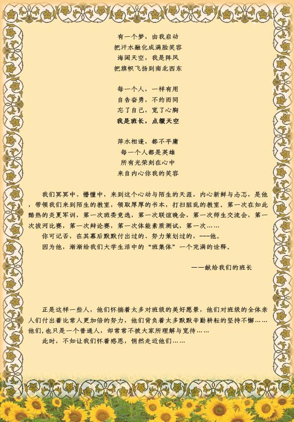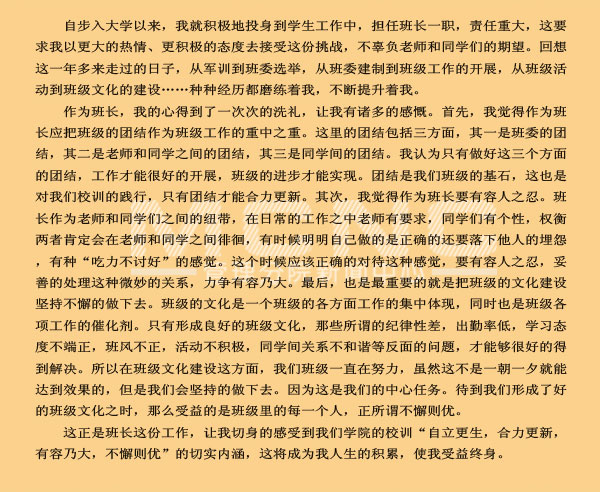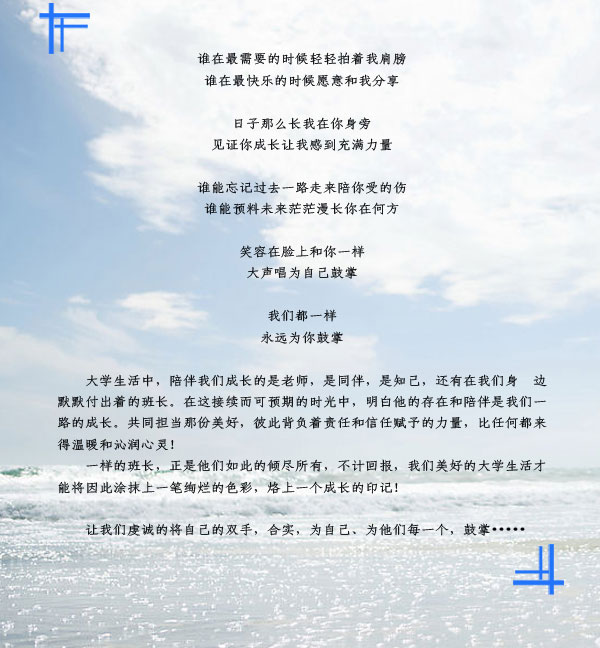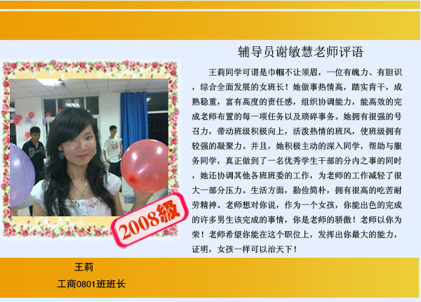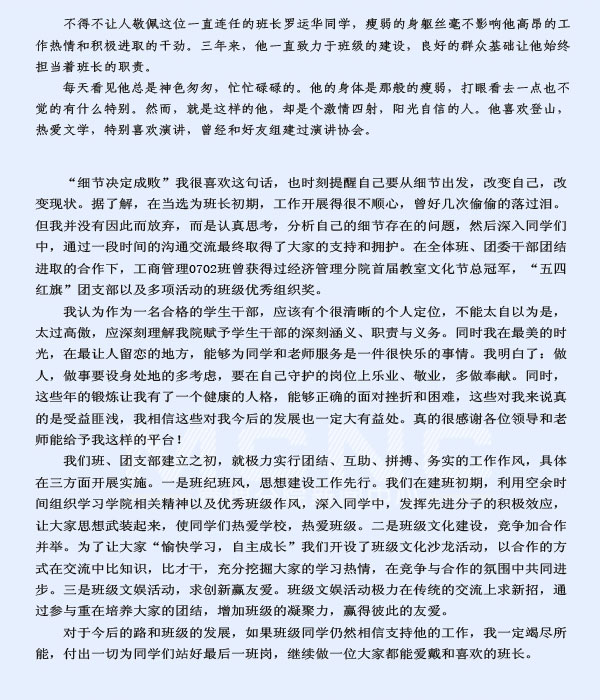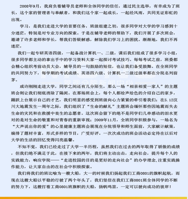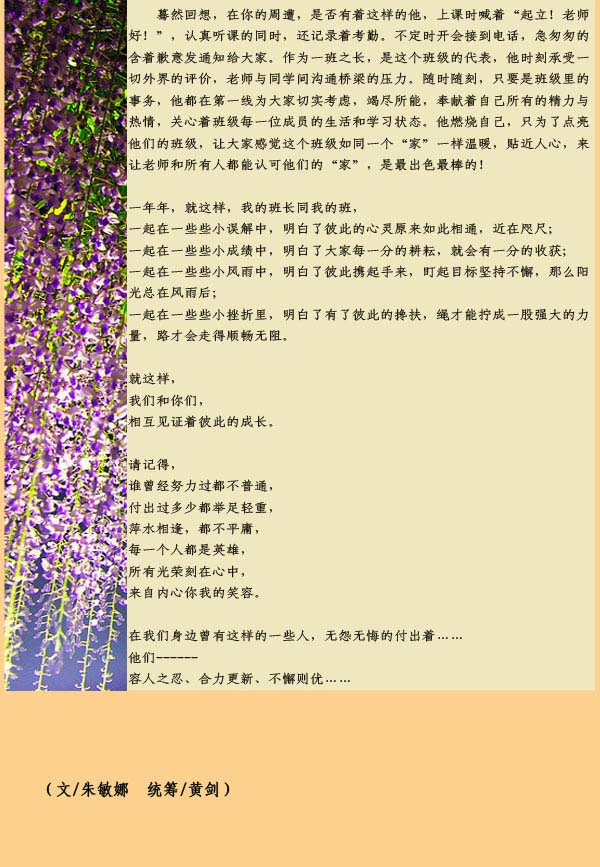 编者按:继学院推出阳光明星show专题之后,各分院也纷纷推出自己分院的阳光学子风采展示板块,管理分院所策划的“榜样的力量”采用图文设计的形式,由学生自己采写、自己设计,以同学们的眼光发现自己身边的阳光明星。近日,更特别推出一期“我的班长我的班”,讲述学生班长们的快乐和梦想。