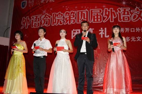 陆丹院长、沈为平院长为获奖者颁奖 5月25日晚19:30,外语分院第四届外语文化节闭幕礼在书德楼报告厅隆重举行,宣告历时近一个月的外语文化节正式落下帷幕。学院党委书记、执行院长陆丹,院长沈为平、副院长秦杰锋等学院领导及外语分院师生出席了文化节闭幕晚会。 闭幕晚会开始,外语分院院长汪士彬教授对本届文化节致闭幕词并宣布外语分院第四届外语文化节胜利闭幕。外语分院英语0901班安彬同学作为学生代表表达了同学们文化节的收获和感受。闭幕晚会中,三个专业的师生们为闭幕晚会准备了精彩纷呈的节目,受到了与会领导、嘉宾和师生的一致好评。 以“秀开口外语 展真我风采 品多元文化 享异域风情”为主题的第四节外语文化节,面向英、日、俄三个专业展开,主要开展了词汇综合竞赛、演讲、歌舞、电影展播、短话剧表演、异域文化展等活动,5月5日开幕,5月25日闭幕,整个文化节持续3周。通过参与文化节的各项活动,同学们提高了外语应用能力,开阔了视野,增强了文化和艺术修养,培养了良好的团队协作精神,充分展示了莘莘学子朝气蓬勃的精神风貌和青春风采。教职工们在活动中,主动积极、精心组织,使得各项活动顺利开展,进一步加强了团队凝聚力和荣誉感。外语文化节是学院校园文化建设的重要活动之一,以培育外语环境,营造学习氛围为主要途径,培养师生“开口说外语”的兴趣和习惯,让学生在活动中不断加强口语训练,加强外语综合应用能力的培养,全面发展,真正成为合格的应用型、实用性的外语复合型人才。