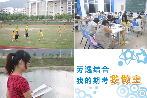 两边兼顾 我的考试我做主 财经分院 财管0902 熊林丽 期末考试时,火热的世界杯让我很是心动,有时候会忍不住打开电脑看看。虽然相对其他同学我花了不少时间在娱乐上,但这却不影响我的考试,几门考试下来,我都感觉挺好,是平时的努力让我在考试阶段变得从容。我想大声地说:我的期考我做主。