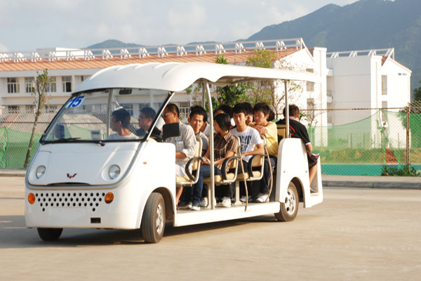 校园电瓶车 常见于旅游景区的电瓶车是校园内的主要公共交通工具。电瓶车从学院大门口出发,途径东、北、西各校区主干道,招手即停。