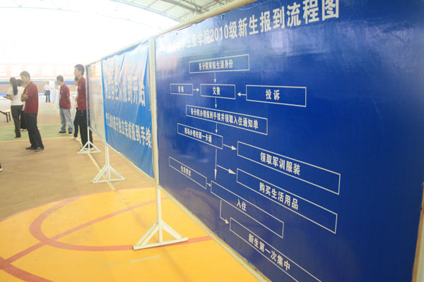 简明清晰的流程图 随着新生和新生家长的不断到来,会场很快变得人山人海。由于前期准备工作充分,迎新工作进行得有条不紊。记者看到,为了方便广大新生报道,学院在每一个项目办理区都设置了告示牌,简明清晰的流程图让报到程序一目了然。考虑到天气热、气温高的原因,工作人员在报到现场安置了大量饮水机免费供应纯净水,并在主席台旁设立了医疗点,还专门在现场设置了家长休息处。