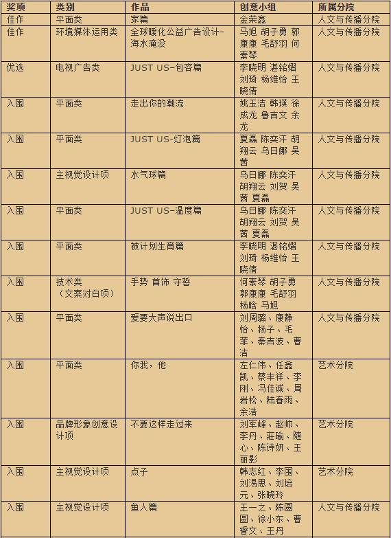 近日,据第十九届台湾时报金犊奖组委会官方消息,经过初审和复决审,我院学生19件作品从来自世界各地的两万件作品中脱颖而出,获得2件佳作(第4名)、1件优选(第9名)和16件入围的好成绩,再度刷新了学院学子参加金犊奖的获奖记录。 自2005级艺术分院学生创办的“瞳”工作组首次从第十六届金犊奖上捧回获奖证书以来,学院平面设计、广告学、动画、产品造型设计等专业学子纷纷在老师们的指导下进军金犊,第十七届、十八届均有18件作品入围获奖。金犊奖也成为学院相关专业老师们以竞赛促教学,全面提升同学们的专业学习兴趣,检验专业学习水平的一个重要平台。在本次竞赛中,张鑫、陈放、宋琪、方超、肖灿、杨治学、张振华等多位老师对参赛学子进行辅导,帮助他们顺利迈向金犊舞台。 时报金犊奖由中国台湾四大报之一的《中国时报》创办于1992年,取“初生牛犊不畏虎”之意,面向全球华人学生。经过18年的发展,金犊奖现已经成为全球华人最大、最具影响力的大学生创意比赛。自1999年进入大陆,在全国学联的支持和指导下,金犊奖已经成为大陆高校每年最重要的文化活动之一。 2010年度,金犊奖吸引了包括中国传媒大学�p厦门大学�p中国美术学院�p中国人民大学等几百所高校积极参与,大陆地区共收到作品11552件,台湾、香港、澳门及海外地区收到作品7000余件。大陆地区由旺旺中时媒体集团主办,台北市文化局、中国广告网、中国网络电视台、国际广告以及台湾中天电视、北美中文网等几十家企业和媒体协办。 第十九届时报金犊奖以“左右开‘功’”为主题,要求作品既要注重“创意”,又要忠实执行“策略”。组委会表示,第十九届金犊奖评比中注重寻找兼具‘销售力’与‘创造力’优秀作品,所有创意表现都必须接受市场上实战营销的考验。 附1:第十九届金犊奖获奖情况
