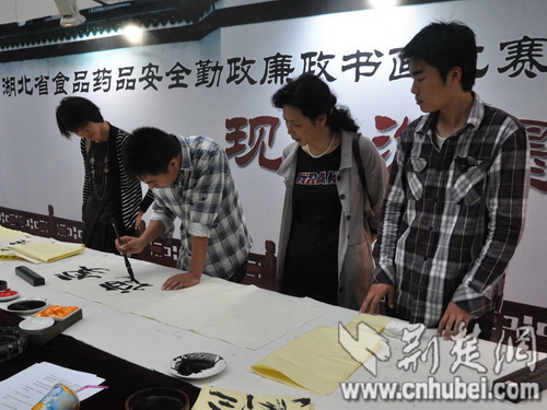 陈才俊的获奖作品 据了解,此次书画比赛活动由湖北省药监局、新华社及湖北日报传媒集团共同主办,以“扬清风正气,保食品药品安全,促社会和谐进步”为主题,从8月初启动到9月中旬结束,历时一个多月,先后有900多人向组委会投稿,参赛作品1000余幅,其中包括200多位国家级和省级书画名家的作品。参赛人员年龄跨度大,最大的有八旬以上,陈才俊是此次参赛年龄最小的选手。 10月12日,书画大赛颁奖仪式在湖北省楚天传媒大厦隆重举行,众多书画名家和大赛获奖选手当场挥毫献艺。 在泼墨现场,一位身着格子衬衣的年轻人格外引人注目,他就是陈才俊,我院艺术分院环境艺术设计专业大三学生,最年轻的参赛选手,一等奖获得者。
