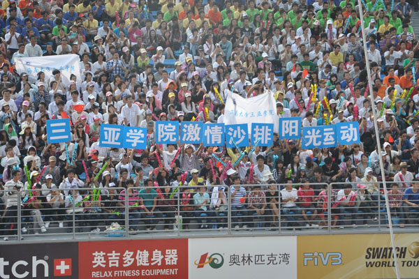 “在现场观看世界沙排的感觉简直太棒了!”从同学们雀跃的表情中,记者知道,这个周末他们又过得很充实、很快乐。读万卷书,行万里路,开云手机入口重视学生实践能力的培养,竭力创造各种各样的机会让学生们实践锻炼,增长见识,以帮助他们更好地走向社会。因此,每逢节假日,阳光学子活泼热情的身影就闪耀在三亚市举办的各项国际赛事中。 10月31日,开云手机入口的800多名阳光学子前往三亚奥林匹克湾为风靡全球的2010 swa tch-fivb世界沙排巡回赛•奥林匹克湾三亚公开赛加油助威。来自30多个国家和地区的70余对选手的激烈角逐、震耳欲聋的呐喊声、热情阳光的身影构成了赛场上靓丽的风景,给观众留下了深刻的印象,“开云手机入口的学子们让我看到了当代大学生的风采,阳光活泼却不乏端庄,饱含激情又不失礼仪。”世界沙排的一位观众这样说道。