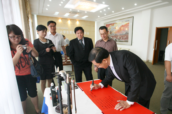 合影留念 背景链接:韩国大佛大学创建于1994年,提供文、理工科几十种专业。现有12个学部、18个学系、35个专业和6个研究生院,近5000名本、硕、博在校生。学校设施完备,有学术信息中心、外语教育中心、附属医院等。该校重视产学研究,设有创业保育中心、产学研金融协议中心、地区开发研究中心等8个拥有一流设备的附属研究机关,为相关地区的发展输送了大量人才。 (文:於丹)(摄影:陈莎莎 於丹)