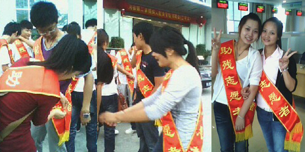 人山人海的招聘会现场 阳光学子们细致的服务确保了现场的秩序,推动着活动的顺利进行 为了能够更好地帮助特殊求职者,一些志愿者向手语翻译学起了“基本功”。“需要帮助吗?”宋同学在接受记者采访时还不忘比划着练习,“今天来求职的大多数是聋哑人,我们只有用聋哑人的语言才能跟他们更好地交流,为他们提供最周到的服务。” 一些残疾人腿脚不便,王磊同学便担负起了背残疾人上下楼的工作,尽管累得满头大汗,但他没有一句怨言。“平时较少接触残疾人,这次才知道他们有多么不容易,我能为他们做点事很高兴。”王磊有些腼腆地说道。 招聘会上,志愿者们真诚耐心的服务与热情的态度获得了招聘单位及应聘者的一致好评。三亚晨报在报道中说:“正是他们的这种志愿者精神和态度,确保了现场活动的正常秩序和顺利进行,为广大残疾人朋友增添了一份求职路上的鼓舞。” 在学校着力培养学生健康人格理念的引导下,阳光学子们积极投身社会,服务周边。通过司法宣传,海洋保护,小学支教等一系列活动体现着他们良好的社会责任感和积极的行动力。他们的行为也受到了广大市民的一致赞誉。 (文:陆和冬雪)(编辑:於丹)(图片来源:管理学院 三亚晨报)