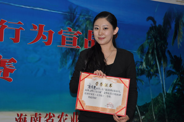 我校在海南省建设国际旅游岛进程中,始终以高度的社会责任感和主人翁意识积极参与其中。本次演讲比赛从前期宣传、人员选拔到比赛评选,学校均给予了高度关注和支持。经过层层选拔,来自人文传播学院播音与主持专业的唐泽慧同学最终代表学校参加全省决赛,摘得桂冠。