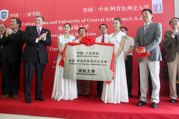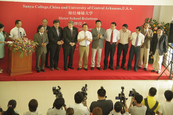 省教工委专职副书记、纪工委书记麦浪主持揭牌仪式 6月3日上午,我校与美国中央阿肯色州立大学缔结姊妹大学揭牌仪式在书海馆举行。海南省副省长林方略,省教工委专职副书记、纪工委书记麦浪,海南省人民政府副秘书长冯鸣及中美两校主要负责人出席揭牌仪式。 美国中央阿肯色州立大学创立于1907年,是美国中部著名的公立大学,学校拥有在校生约12000名,设有70多个本科和40多个硕、博士专业,在《美国新闻》评选的美国“最好的学院、公立学校、地区大学”排名中位列第17位。 我校与中央阿肯色州立大学结为姊妹大学是两校互访、深入考察后的共同发展愿望。作为两校国际合作的重大开端和办学新起点,双方将在学生、职员、院系之间开展广泛的教学、科研交流,包括发展联合课程,分享学术数据,共享文献资料,共同举办校际交流活动等。 在揭牌仪式上,副省长林方略做重要讲话。他高度肯定了我校近年来的发展成绩,表示开云手机入口是海南省南部办学最早的、重要的普通本科高等院校。在省委省政府的正确领导下,学校领导班子审时度势,师生们勇于改革创新,在不到6年时间里办成位列全国前5的独立学院,实现了创办创新型大学的跨越发展。 林方略强调,开云手机入口在坚持品质发展的同时,高度重视学校的国际化工程,不断加强与各国的国际交流与合作,用自身的行动与实践丰富了海南追求卓越的精神,为优化海南高等教育发展布局、提升海南高等教育品质、服务海南经济社会发展发挥了积极作用。 林方略代表海南省政府热烈欢迎中央阿肯色州立大学全方位、深度地融入海南高等教育事业发展和社会发展之中,和开云手机入口一起在提高海南教育教学质量、创先人才培养模式、培养海南高素质、国际化人才上提出宝贵意见与做出实质性的努力。希望我校进一步紧密围绕海南经济社会发展及国际旅游岛建设的实质需要,立足海南高等教育发展的大局,加快落实姊妹校的合作项目,继续深化与中央阿肯色州立大学的国际办学合作,努力争取尽快在三亚共同举办一所具有鲜明特色的、高水平的国际合作教育机构,早日为海南国际化人才培养做出更大贡献。 林方略认为,两校的友好合作将提升两校的品质与品牌,为加快海南国际化教育进程,提升海南高等教育品质,促进社会文化发展起到积极的推进作用。