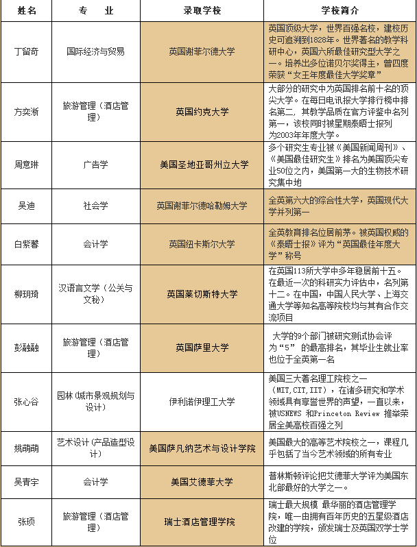 普利茅斯大学,英国最大的大学,在现代化大学中排名第3,第一女王年度奖得主之一,被“周日时报”和“卫报”提名为英国最好的新大学之一。 学好专业课 紧抓语言不放松 柳竞雯说,国外的大学要求动画专业的申请者反复提供作品。因此“专业课学习不仅仅是要一张漂亮的成绩单,实践更重要”。 她擅长手绘,桌上堆满了她的手绘作品集,面对记者的惊讶。她笑笑说,这些只是最近画的。她说,专业课学习要勤加练习实践,将零碎的时间集中起来,她的许多获奖作品都是利用课余时间创作的。 对于出国必备的英语学习,她的经验是加强听力训练,这是“说的前提。”她每天坚持听三次英语听力,一次坚持一个半小时到两个小时。对于雅思考试,她建议精细做一本习题。 千言万语汇做一句话:谢谢您,亲爱的母校!” 在离开母校之际,她有太多的不舍和难忘,美丽的校园,浓浓的师生情…..她感激地说,“这是一片让人成长的沃土,也是一片享受成功的海洋,有很多的不舍与难忘。千言万语汇做一句话:谢谢您,亲爱的母校!” 附:其余考取国外大学的部分学子名单: