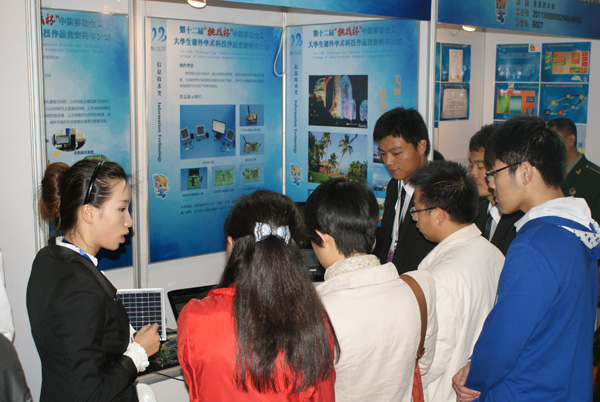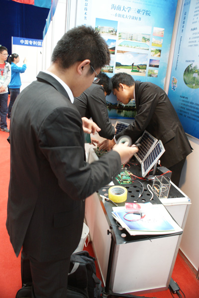 参展会上向各高校学子介绍科技作品设计原理与应用价值 接到全国挑战杯组委会的通知是在今年9月,第十二届“挑战杯”全国大学生课外学术科技作品竞赛的决赛是在大连理工大学举行,《基于无线传感网的智能灌溉与报警系统》这一作品进入终审决赛。“接到通知时,我们几个开心的在实验室里相互拥抱。第一时间把这个好消息告诉了吕振肃老师和杨志民老师,老师不断鼓励我们,说要继续夯实作品的实用价值基础,让系统构架再清晰一些,并针对控制终端加强构建,提升整体的科技含量。”在谈到当时接到全国终审决赛的通知时,苏玮依旧抑制不住内心的兴奋。 在赛前的一个月时间里,他们每天都泡在实验室。继续在作品设计上下功夫,并在原来的基础上增加了无线传感网和gsm网络搜集以及控制各个节点工作状态的装置,根据需要选择不同的控制终端。作品以绿色能源为理念,在使用的过程中由太阳能供电,符合海南绿色低碳岛的建设需求。 “当这一科技作品在我们的努力下,第一次投入小批量生产使用成为了产品时,我们对它的前景又作了更详细的规划。”看着作品在四个人的手中一步步成熟,苏玮和同伴们很开心,“累点没关系,能够取得好成绩我们付出的所有努力都是值得的。”