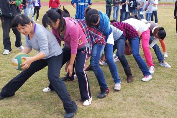 学生女子组实心球传递,趣味运动带来更多欢乐