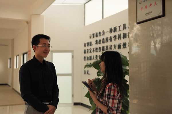 记者采访10级旅业商务英语专业的苏丽娜同学 记者在书德楼遇到外语学院10级旅业商务英语专业的苏丽娜同学,她说,“感觉这学期学校的变化很大,听说过一段时间辅导老师办公地点要移到学生社区。真没想到,辅导老师居然会和我们做邻居,还蛮期待的。”聊到一周下来上课的感受,她说:“开学前就听说学校这学期要狠抓‘学风’,刚刚返校就有老师们反复叮嘱我们要按时到课和注意预习,开课第一天也有学校教学管理中心的老师们去巡查课堂情况,我们也觉得‘严是爱宽是害’,学校管的严格一些,也是为我们好。” 在书新一号楼的教师休息室,记者跟几位课间休息的老师漫谈起来。老师们也表达出对新学期第一课的“兴奋”。讲台是老师的舞台,学生是老师最好的观众。一堂课如一出戏,精彩与否除了剧本要好,效果全看场上场下的互动。良好的课堂纪律不仅是对老师的尊重,学生在课堂上及时且频繁的交流反馈可以激发老师的表达欲,这一来一往的争鸣构成一支学术回旋曲。 “没想到计算中心扩建后,变了这么多。”走出计算中心的管理学院09级信管专业的邢益帅同学高兴地对记者说,“以前机房可能只注重了实用功能,没有什么艺术感,现在的布置更合理更人性化,特别是erp实验室那种围桌式的组合,特别适合我们上课时讨论,设计上的艺术感还能让同学们上课的心情更愉快。这学期实验室的课也增加了不少,还更新了一批最新的设备,我们的积极性都很高,大家都早早的到教室了。”