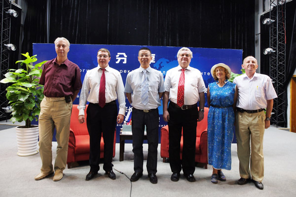 合影留念 愉快的洽谈过后,下午3:00在我校书海馆贵宾室,陆丹教授与耶达文斯基先生正式签署了两校合作的文件,双方对未来的合作和发展前景充满了信心和期待。 两校校长对话 强调特色教学共同发展 针对中俄两国现代化历程中的相同点和不同点、全球化对中俄两国的影响和认识、全球化对本土文化影响和中俄两国高校的发展走向这四个问题,3月19日下午3:00在我校uctv演播大厅,陆丹教授和耶达文斯基先生与我校师生再度进行了愉快的交流。