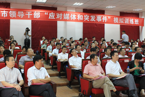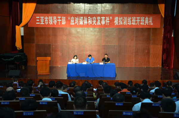 三亚市领导干部“应对媒体和突发事件”模拟训练班在我校书德楼顺利开班 据了解,这次训练班分两期进行,其中包括六个不同主题的课程以及模拟实训、复盘推演等内容。来自清华大学、中国人民大学、中国传媒大学等高校的学者专家将为我市领导干部讲授《网络舆论的挑战和引导》、《危机管理与媒体应对》、《微博时代的政务运营》等主题内容。