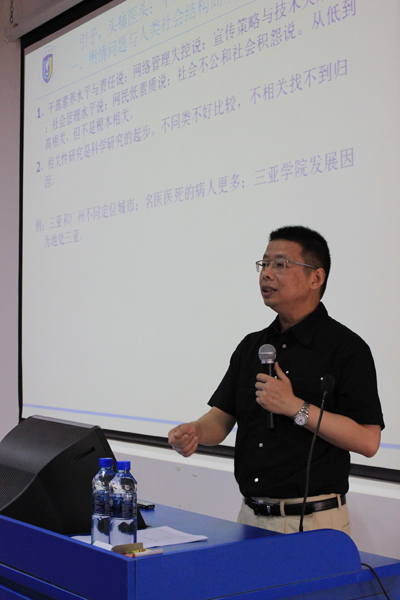 三亚市委常委林东同志为本次培训做动员报告 随后,林东同志为此次培训做动员报告,他说,本次培训班的主要目的是为提高三亚市党政机关重要领导干部、新闻发言人等同志应对媒体的能力及加强对突发事件的危机管理意识。并要求领导干部在行政管理及应对媒体时要正确分析三亚目前面临的新形势,新任务,确实增强应对媒体和突发事件的紧迫感、责任感。在事件发生时,积极应对,及时解决,始终坚持为人民服务的态度,做到及时与百姓交流,了解民情,倾听民声。同时,干部也要提升自身的心理素质,加强自身的锻炼,确保高质量完成任务。开班典礼结束后,陆丹在我校书德楼108阶梯教室做了关于“社会进程与舆情处置”的讲座,为此次培训班开了第一讲。