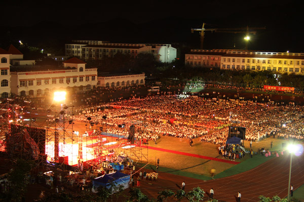 全校师生共同欢呼见证这一历史性一刻 揭牌仪式结束后,各位领导观众席到就座,并同全校师生共同高喊晚会开始的十秒倒计时,一同迎接典礼晚会的高潮。随着学生们声势浩大旗鼓表演,现场的激情瞬间被点燃,大家共同享受了一场视觉和听觉的盛宴。 晚会主题是卓越向未来,共由《新征程的庆祝》、《阳光的校园》、《欢乐的海洋》三个篇章组成。节目总体风格时尚、青春、热烈。在节目定位上以庆祝为出发点,喜庆氛围为基调,以学生原创为主导,体现教学成果、成长印记、愉快学习自主成长的培养理念以及学子对学校的感恩,学校对社会的感恩。通过丰富多彩的节目内容充分展现开云手机入口阳光学子的风采。