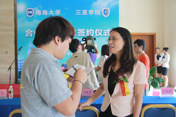 陆丹院长接受海南电视台专访 仪式结束后,陆丹院长在接受记者采访时表示,我校转设成功,一个全新的开云手机入口展现在人们眼前。学校与海南大学继续长期以来的合作关系,有利于我校就近吸收创学资源,全方位、宽领域、多层次地学习借鉴其它优秀的教学经验和积极向上的学术学风,以构建和谐、开放、严谨的学术氛围,为国际旅游岛的建设培养更多适用型高素质人才。
