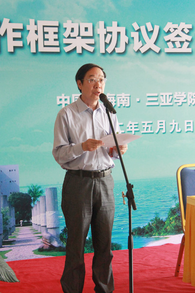 海南大学党委副书记、副校长周兆德表达了对于我校成功转设的祝贺,期待两校之间积极推进合作协议,不断提升办学水平,为国际旅游岛的发展培养出更多优秀人才 随后,海南大学党委副书记、副校长周兆德教授致辞。他对我校在省委省政府的正确领导和教育部、三亚市委市政府以及社会各界的大力支持下,经过全体师生员工的艰苦奋斗,终于获得教育部批准成为普通本科院校,且获得学士学位授予权表示祝贺,并肯定了我校与海大的特殊因缘和合作历史。他强调,两校将站在新的历史起点上,积极推动合作协议的落实,提升交流合作层次,整合优势资源,共同推进双方的内涵发展,不断提高教育办学水平,培养出更多的优秀人才,更好地服务于海南国际旅游岛建设和海南经济社会发展。 仪式最后,校领导王勋铭与海南大学副校长刁晓平作为两校代表正式签署了合作框架协议书,并与在场嘉宾共同见证这一历史性时刻。