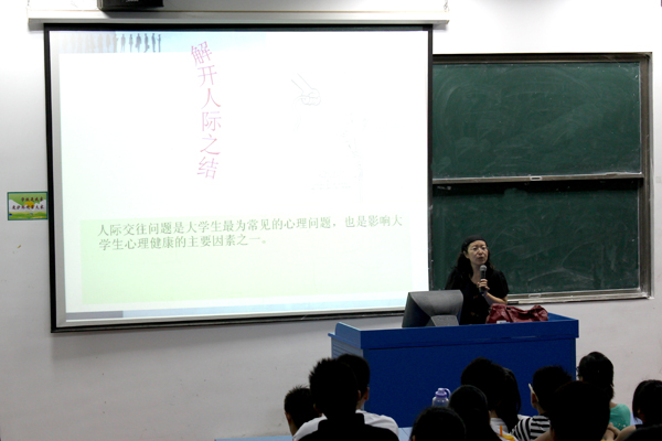 掌握人际交往的良好方法——专题知识讲座启迪心智 知识讲座,帮我们更好地认识心理健康 5月22日晚19:30,一场主题为“朋友的不同楼层”的心理健康知识讲座在书德楼216教室展开。讲座由应用心理学专业的宋岩教授主讲,她着重强调“沟通障碍”在大学生冲突来源中排在首位,因此提高大学生人际交往能力,增强大学生人际适应,要把提高沟通能力作为培养和教育的重点,而建立良好的人际关系关键在于掌握沟通的本领。宋老师在整个报告中,采用了理论与图片、音乐相结合的方式给同学们展现了大量的生活现实中与人际关系相关的问题。特别是在沟通方法的讲解中,以一副“沟通管道”形象生动地表达出如何结合视听说想他人表达自己的想法,同学们在角色扮演、小游戏的互动中深刻的体会到了人际交往的意义。此次知识讲座在一场潸然泪下的《生命列车》的短片中画上了句号。