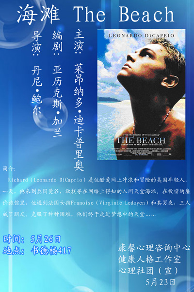 心理电影展 心理电影展,从影像中寻找心灵的家园 心理电影展有针对性地选取与现代大学生的学习、生活密切相关,并适合大学生生理、心理特点的四部心理电影:《我家买了动物园》、《兔子洞》、《海滩》、《海上钢琴师》。于每周六晚上19:30在书德楼417教室放映。通过电影自身的感染力及专业教师的点评,促进大学生正确价值观的确立和健康人格的形成。看过《海滩》后,有的同学这样评论:人人起初都会渴望一个那样的世外桃源,而幸福还是要靠脚踏实地。