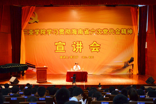 学习贯彻海南省六次党代会精神宣讲会现场 为学习贯彻海南省六次党代表会精神,6月13日16时,我校在书德楼报告厅召开宣讲会,海南大学李辽宁博士担任主讲人,各学院老师代表和学生代表参加本次会议。 海南省六次党代表会,是在海南省实施“十二五”规划取得良好开局、国际旅游岛建设进入关键时期召开的一次重要会议。而在此次宣讲会上,李辽宁博士就“坚持科学发展,实现绿色崛起”一主题,主题鲜明、旁征博引、理论联系实际、深入浅出的对此展开一系列讲解。