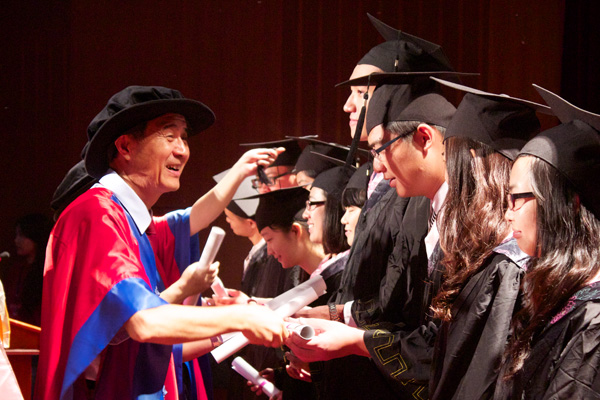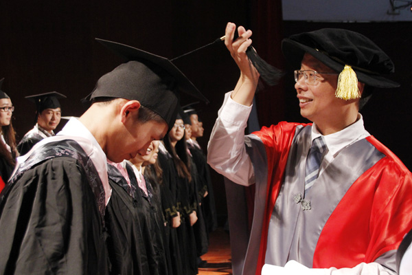 党委书记、院长陆丹等导师一一为毕业生扶正流苏,祝贺他们获得学位