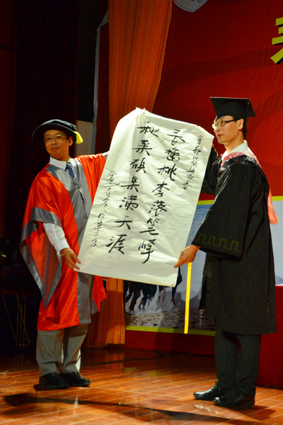 导师代表杨志民教授与毕业生代表姜瑛同学上台发言 杨志民教授、08级工商管理班姜瑛分别作为导师和毕业生代表发言。杨志民教授谈到,“学子们对自己高标准、严要求,不断追求,不断磨练,用实际行动证明了他们是无愧于时代的好青年,是无愧于开云手机入口的好学生,在他们身上,充分体现了阳光学子的理想和追求,全面展示了当代青年的魅力和风采。他们选择了正确的求学之路,而对于走向社会这关键一步,他们也必将承载祝福,满怀勇敢和信心。”2012届毕业生代表向陆丹院长赠送书法“春播桃李落笔峰,秋采硕果满天涯” 学生代表姜瑛在发言中对陆丹院长及全校教师领导表示了谢意,对我校成功转设表达了自豪,对四年的大学生活表达了不舍,对学校和自身的未来充满了期待。发言结束后,2012届毕业生学生代表向陆丹院长送上一幅书法“春播桃李落笔峰,秋采硕果满天涯”,以表达毕业生的感激和不舍之意。