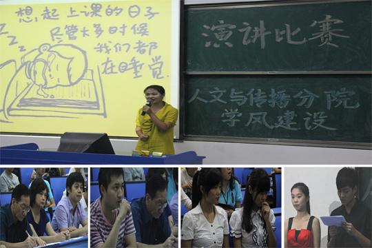 我院组织的青年教师多媒体教学比赛 学院现设汉语言文学、公关与文秘、广告学、播音与主持艺术等四个专业,并拟将逐渐增设文化产业与管理方面的专业方向。目前学院共有在校本科生1671人,教职工41人,其中教授5人,副教授3人。 汉语言文学专业以高扬人文精神,塑造健康人格为出发点;以崇尚学术,提升人才质量为工作目标,形成了一支素质优秀、富有创新思维的教学与科研团队;强调理论与实践并重,注重传统文化与当代教育结合;铸造品德、学理、技能一体化的培育模式。 公关与文秘专业培养系统掌握汉语言文学专业的基础知识,熟悉文秘工作的基本特点和内容,具有较强的口头和书面表达能力,能在党政机关、企事业单位从事秘书公关类工作,具有创新思维和实践能力的应用型、实用性高级专门人才。 广告学专业精心培养学生掌握策划与制作、经营与管理的基本理论和技能,具备完善广告道德品格、健全广告法律意识、优秀沟通能力等基本素质,善于在广告公司、媒体等部门工作的创新性、应用型高级专门人才。