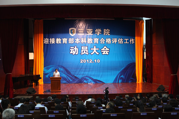 我校隆重召开2014年教育部本科教学评估动员大会 为进一步促进学校发展,迎接教育部2014年本科教学评估,努力实现学校各项既定工作目标和“十年卓越”进程计划目标,10月10日下午,我校在书德楼报告厅隆重召开2014年本科教学评估动员大会。我校党委书记、院长陆丹、校领导王勋铭、沈建勇出席本次大会,各学院教工党支部书记、专业负责人及以上干部、教务员、机关人员参会,会议由教务处副处长隋珊珊主持。 我校高度重视迎评工作,本次动员大会旨在鼓舞士气、提振人心,为全面启动各项迎评工作做好思想准备,希望紧抓迎评机遇,将我校办学水平提升到新的高度,实现以评促建设、以评促管理、以评促改革、以评促创新、以评促发展。将常规发展和改革创新发展有机结合,不仅要把我校建设成为符合国家教育部要求的好大学,还要将我校建设成为海南经济大特区中民办教育改革创新发展的一面旗帜。