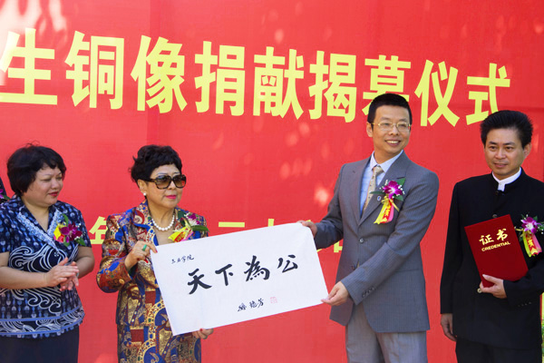 孙穗芳赠送陆丹写有“天下为公”四个大字的文书作为纪念 铜像揭幕后,嘉宾领导共同在铜像前合影留念。孙穗芳和王勋铭共同为孙中山铜像敬献鲜花,全体行鞠躬礼。最后,陆丹为孙穗芳颁发捐赠证书,孙穗芳赠送陆丹写有“天下为公”四个大字的文书作为纪念。本次孙中山铜像揭幕仪式就此圆满结束。 (文:大学生记者团 朱琪昊 沈歆玫)(图:大学生记者团 张桢干 蒋晔峻)(编辑:袁欣)
