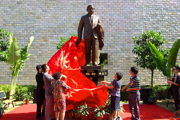 孙穗芳、孙嘉和、简秋雄、李海凤、裴克山、陆丹共同为孙中山先生铜像揭幕 随后,孙穗芳、孙嘉和、简秋雄、李海凤、裴克山、陆丹共同为孙中山先生铜像揭幕,红色绸缎揭开,孙中山铜像赫然映入眼帘。孙先生身着西服,目光坚定,迈步前行。该铜像高4.5米,其中青铜全身塑像高2.2米,座高2.3米,基座直径1.5米,基座用八角形花岗石分三层建造,铜像基石设计成8角型,分3层。底层刻有“忠孝仁爱、信义和平”;第2层是孙中山先生的思想精粹阐述;第3层刻有“格物、致知、诚意、正心、修身、齐家、治国、平天下”。如此表明,孙中山先生的思想酝酿自深厚的中华文化思想 ,值得广大青年学生传承学习。