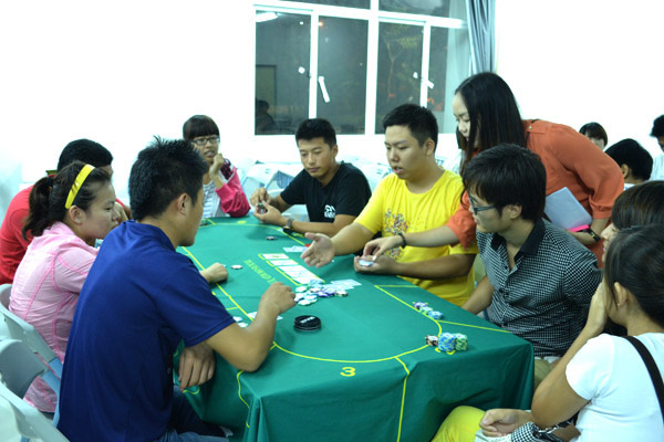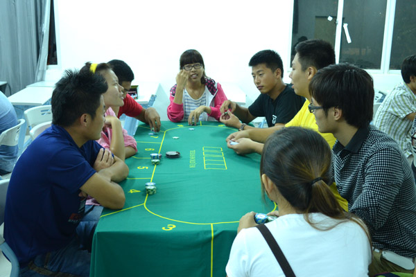 学生们分小组认真练习 “德州扑克专业发牌手实训课”很受体育竞猜专业学生的欢迎,体育竞猜1101班的林曦龙同学谈及此次课堂感受说:“在常规的日常课程学习中,《博彩社会学》、《体育博彩概论》、《上瘾行为学》等贴近实际的专业知识培养了我对专业的浓厚学习兴趣,发牌员实训课堂上接受国际性的扑克比赛发牌技能训练,更是开阔了眼界,巩固了书本知识。 据悉,我校旅业管理学院体育竞猜专业是在国际旅游岛发展战略提出之时,我校紧抓机遇,在2010年第一个获批成立该专业方向的本科院校。旅业管理学院经过一年多精心准备,于2011年秋季第一次招生,该专业依托旅业管理的特色专业“旅游管理”,借“旅游管理”专业成功的办学模式和正确的方向选择,完成其专业在发展初期的学科建设。为培养国际化、高水平的体竞职业人,该院一直致力于为学生提供实践平台,12月中国扑克游戏锦标赛将在海南三亚举办,届时该院将派出30位同学作为发牌员志愿者参与到比赛中,与赛事联合,让学生参与其中,能将学生课堂所学与社会需求对接,满足学生职业发展的需求,推动体育竞猜专业的科学发展。 德州扑克简介:德州扑克,20世纪初开始于德克萨斯洛布斯镇,据传是当地人为了消磨时光,发明的一种可以有很多人同时参加的扑克游戏。1925年,德州扑克第一次传入德克萨斯州的达拉斯市,后来又传至拉斯维加斯,自此德州扑克就被发扬光大。德克萨斯扑克全称为texas hold’em poker,中文简称为德州扑克。它是一种玩家对玩家的公共牌类游戏。一张台面至少2人,最多22人,而一般是由2到10人参加。德州扑克一共有52张牌,没有王牌。每个玩家分两张牌作为“底牌”,五张由荷官陆续朝上发出的公共牌。在开始的时候,每个玩家都会发得两张面朝下的底牌。在经过所有押注圈以后,若仍不能分出胜负,游戏会进入“摊牌”阶段,也就是让所剩的玩家亮出各自的底牌以较高下,持大牌者获胜。因技巧性强,易学难精又被称为“扑克游戏中的凯迪拉克”。(发牌手又称为荷官) (文图提供:艺术学院 旅业管理学院)(编辑:袁欣)