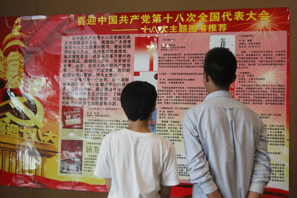 图书馆内,同学们驻足十八大专题展板旁,浏览以十八大为主题的图书推荐