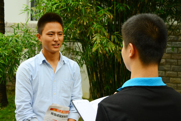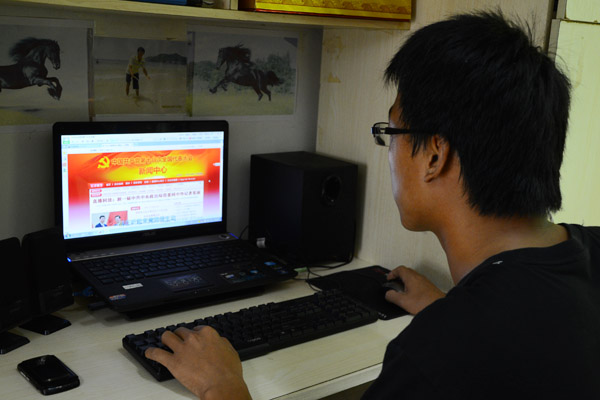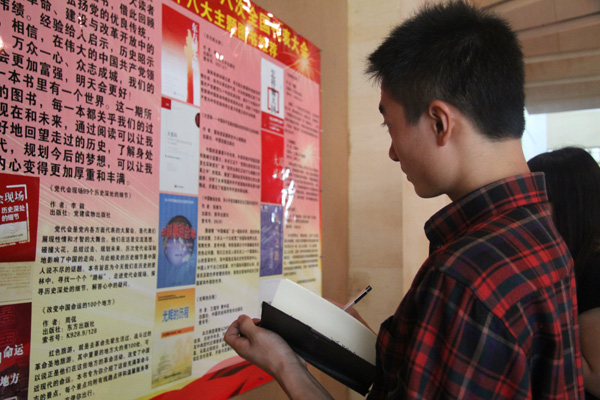 认真记录十八大精神纲领 图书馆里,同学们积极阅读十八大的相关书籍、报刊,观看十八大的主题展板,并将网络作为获取盛会信息的第一时间资料,以饱满的精神状态响应十八大对广大青年的号召。来自高尔夫1201班的姚通同学说道:“我现在是一名共青团员,十分向往加入中国共产党。作为一名大一新生,学校已组织各项活动,帮助我们了解党、认识党、学习党,并为我们入党提供了一系列的培养和教育。十八大是一场全国人民的盛会,对我们青年学子提出了很高的要求,我会按照党的要求,做好自己,争取早日加入党组织。”