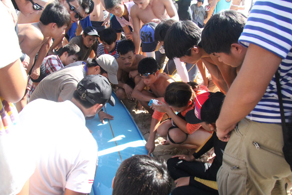 感受大赛魅力,亲水专业合影留念 11月25日10时,一堂生动有趣的专业课程在万宁国际冲浪节比赛地上演,日月湾冲浪俱乐部工作数年的冲浪外籍教练大山与我校两位专业老师的指导下,11级亲水专业的学生分组将八块冲浪板安装尾鳍并且打上蜡,进行下水前的最后准备与安全教育。这是同学们在完成理论学习的基础上的一次观摩课和实训课。 外籍教练大山接受记者采访时谈到,冲浪运动是以海浪为动力,利用自身的高超技巧和平衡能力,搏击海浪的一项运动。这项激情与安全并存的体育休闲活动,随着海南国际旅游岛的建设发展,越来越受到很多人的追捧。冲浪板对于冲浪手而言,亦敌亦友,因此特别要注意的是,人、板、浪永远都不要在同一条线上。良好地掌握冲浪技巧是在海上自由体验的关键。 经过张善斌和张天聪老师半小时的指导后,我校阳光学子带上冲浪板,开始了愉快的冲浪之旅。在体验冲浪过程中,他们用自己顽强的意志和充足的体力、强健的肌肉去与海浪搏斗着,他们强烈的决心征服了汹涌的海浪,最终不少学生成功的完成冲浪滑行。 媒体聚焦阳光学子谈体验冲浪感受