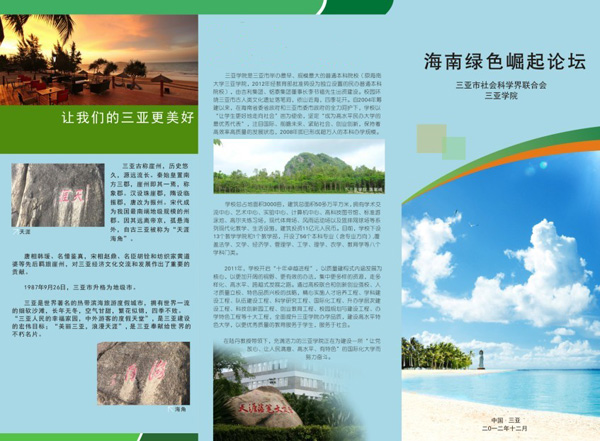 绿色是海南的底色、本色、生命色,绿色也是中共十八大报告中的闪亮字眼和热门话题,绿色还是海南省实现地区崛起设定的发展路径和目标指向。建设美丽海南,聚力科学发展,发挥学术智库,夯实绿色崛起,靓丽绿色名片。由三亚市社会科学界联合会和我校联合主办的“海南绿色崛起论坛”将于12月6日—8日在我校隆重召开。届时将有近百位省市宣传部门和省社科联相关领导,国内外知名专家学者、国内一流学术期刊编辑,三亚社科联成员和三亚高校教师到会,共话海南绿色崛起的相关话题。 一座城市的崛起需要理论自觉,需要一群关注并致力于城市发展的有心人。三亚作为海南国际旅游岛的南部重镇,实现三亚绿色崛起对海南绿色崛起意义非凡。党的十八大将科学发展观确定为党的指导思想,首次提出“美丽中国”,将生态文明建设列入“五位一体”的社会主义建设事业的总体布局中。海南省第六次党代会正式提出“海南绿色崛起”之路,探究“绿色崛起”深刻而丰富的学术内涵,结合“让我们的三亚更美好”大讨论活动,通过三亚社科界及国内专家学者卓有成效的理论工作和高端对话,实现三亚城市崛起从学理挖掘到行之有效的实践路径,为全国乃至全世界绿色发展道理路提供有益参考,这也正是三亚市社科联和我校联合组织本次论坛的出发点和落脚点。 据了解,本次论坛以海南绿色崛起为总论题,分四大分论题,第一,“绿色崛起”的学理依据和理论内涵;第二,海南及三亚实现“绿色崛起”的可能路径;第三,国外“绿色崛起”的比较研究;第四,国内学术界如何协力海南实现“绿色崛起”。围绕本次论坛组织开展论文征集、主题报告、主题对话、圆桌会议、学术讲座、媒体参观等活动。 海南自1999年提出建生态省,到第五次党代会正式提出生态立省,到制定实行海南省全国生态文明建设示范区的战略,无不烙着生态文明、科学发展的印记。一条绿色、低碳、可持续的科学发展之路正在800多万海南人民脚下延伸,成为全省人民的统一意志和共同行动。今年4月,海南省第六次党代会正式提出了“海南绿色崛起”之路,这是海南发展的又一次全新起跳,是海南进一步探索保护与发展相融的绿色道路,是海南省打造国际旅游岛的必然选择。 任何的发展都以“人”为中心,起因于“人”,落脚于“人”,其过程也依赖于“人”,海南绿色崛起也不另外。该路线坚持以人为本,环境友好、集约高效、开放包容、协调可持续发展。绿色崛起以科学发展理念和正确政绩观为思想保障,最重要的前提是科学规划,最核心的支撑是产业振兴,最根本的出路是开放改革,最基本的依托是生态环境,最终极的目标为打造中外游客的度假天堂和海南人民的幸福家园。海南省委、省政府本着执政为民,将人民脸上的笑容和内心的满足感当做最大的政绩,保持海南长远发展,履行造福子孙后代的历史职责,带领全省人民不懈努力,正奋斗在绿色崛起的康庄大道上。 (文:袁欣) 学术智库靓丽绿色名片――喜迎海南绿色崛起论坛在我校召开