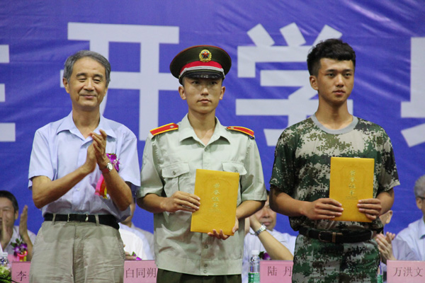 校领导沈为平为2013年军训期间表现优秀的先进集体与个人代表颁奖并合影