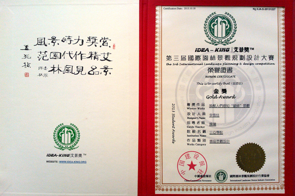 阳光学子获得“艾景奖idea-king2013第三届国际景观规划设计大赛金奖”