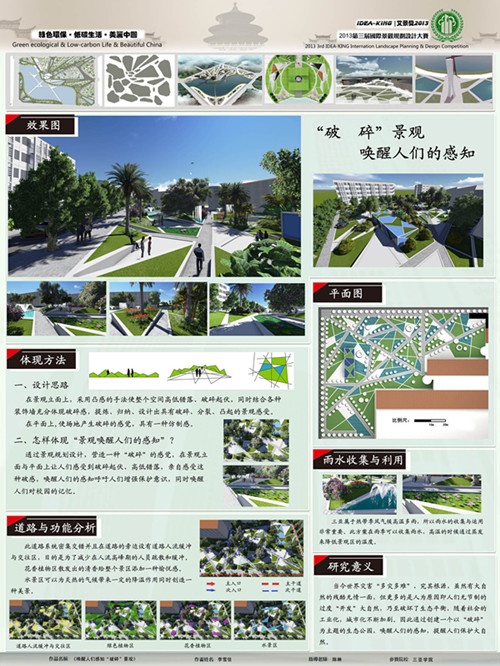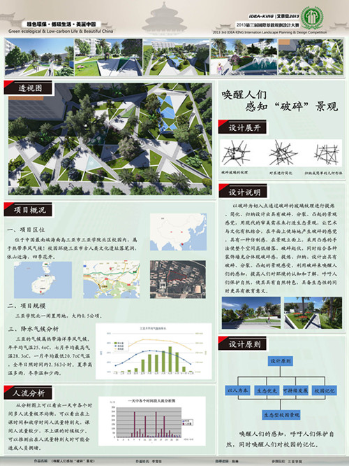 2013届“艾景奖idea-king”以“绿色生态•低碳生活•美丽中国”为主题,《唤醒人们感知“破碎”景观》针对这一主题以开云手机入口北校区局部校园为设计主体,提出并遵循“破碎”的设计理念,通过破碎的玻璃纹理提炼、简化、归纳设计出具有破碎、分裂、凸起的景观感觉,用现代的审美需求来打造生态景观,让艺术与文化有机结合,表达唤醒师生们对环境的认知与了解,从而达到保护校园生态环境的设计目的,作品整体在体现景观自然特色、生态特色的同时更彰显了教育意义。