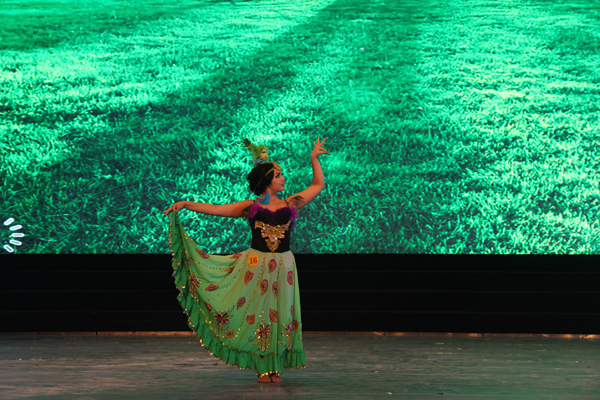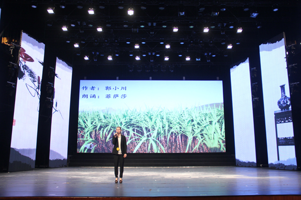 舞台上,我校国际旅游管理专业阳光学子雪莲身着中国特色服饰旗袍,从容不迫地进行自我介绍,一首感情饱满的《相信未来》朗诵诗,一幅现场创作的毛笔字,一段激烈热情的蒙古舞,精彩的表演深深吸引着评委和观众眼球;广告学专业的哈萨克斯坦女孩贾娜热情朗诵《青春 三亚》,表达对三亚的喜爱,她漂亮灵动的孔雀舞与富有哈萨克斯坦风情的民族舞蹈《春天来了》点燃现场气氛;莫斯科国立大学交换生、汉语言专业国际学生菲萨沙以流利、清晰的汉语将诗朗诵《甘蔗林 青纱帐》的意境淋漓尽致地展现,一首高难度的歌曲《征服》和活泼欢快的俄罗斯舞蹈《卡林卡》赢得掌声连连。